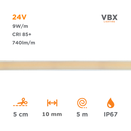 NEON COB LED strip top view waterproof, with 480 LEDs/m, power 9,6 W/m at 24V. It is supplied in 5 meter reels, which can be sectioned every 5 cm. Fixing with double-sided tape. The neon cob strip is the ideal solution for all applications outdoors that require linear and uniform lighting, with minimum bulk. For architectural lighting, backlighting, edge lighting. Marking of paths and profiles/contours.