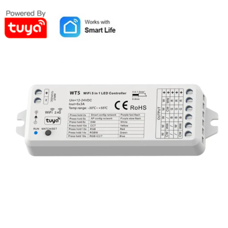 Controller for Tuya WIFI&RF app. 5 channel controller, 3A/ch. 12-24Vdc. RGBW, RGB, CCT, DIM, RGB+CCT