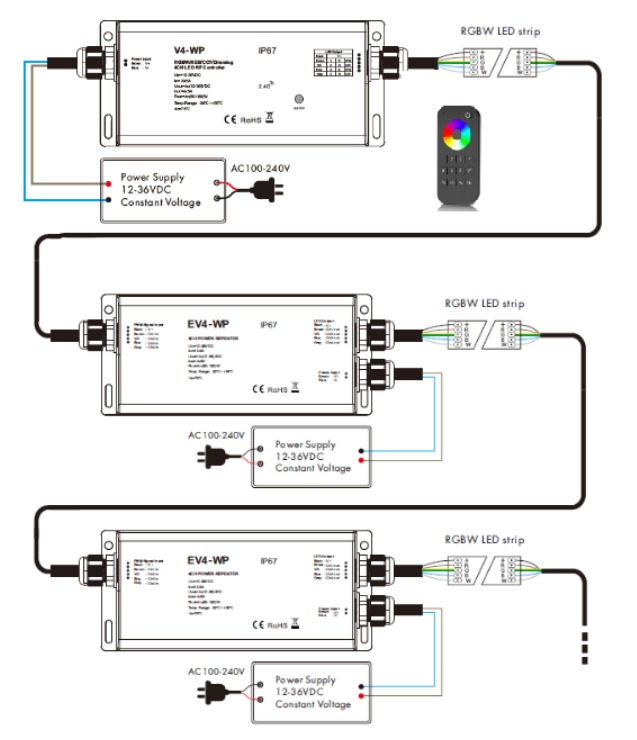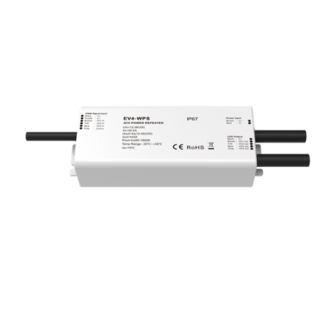 IP67 Waterproof Outdoor RGBW wired Signal Repeater. Model EV4-WP (176x78x38mm) and EV4-WPS (153x57x34mm). It can be connected to extend all types of control units, dimmable, tunable, rgb, rgbw, dali, dmx.