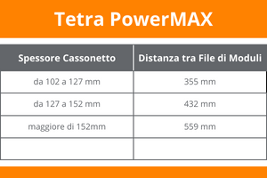 Miglioramento della distanza tra file di moduli LED: La nuova spaziatura Tetra® PowerMAX 24V Tetra® PowerMAX è migliorata in media del 35%, consentendo di impiegare meno moduli LED e adottare spaziature più ampie tra una linea di moduli e l'altra. Vengono riportati alcuni esempi di seguito.