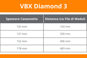 La tabella si riferisce alla distanza massima alla quale possono essere disposte le file di moduli LED tra loro in relazione allo spessore del cassonetto.