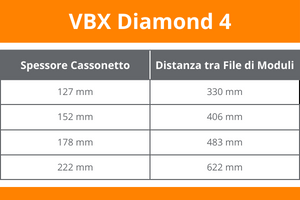 La tabella si riferisce alla distanza massima alla quale possono essere disposte le file di moduli LED tra loro in relazione allo spessore del cassonetto.
